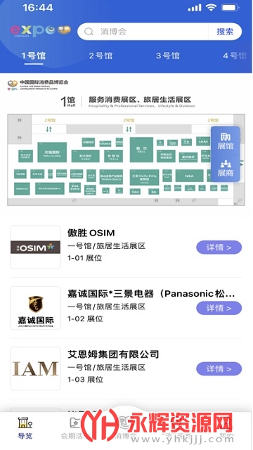 2、【展会】展示了1号馆、2号馆、3号馆、4号馆、5号馆、7号馆、8号馆的展商以及展馆分布情况等,帮助用户快速查阅相关展商位置情况。