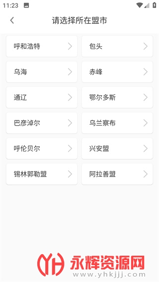 2、点击健康卡申领,进入盟市选择界面,用户只需按照当地地址选择即可,比如选择呼和浩特;