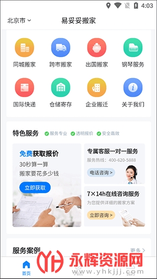 1、通过本站下载易妥妥搬家app安装进入,在首页我们能看到同城搬家、跨市搬家、出国搬家等服务;