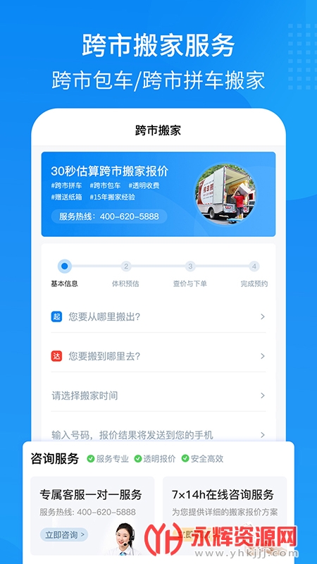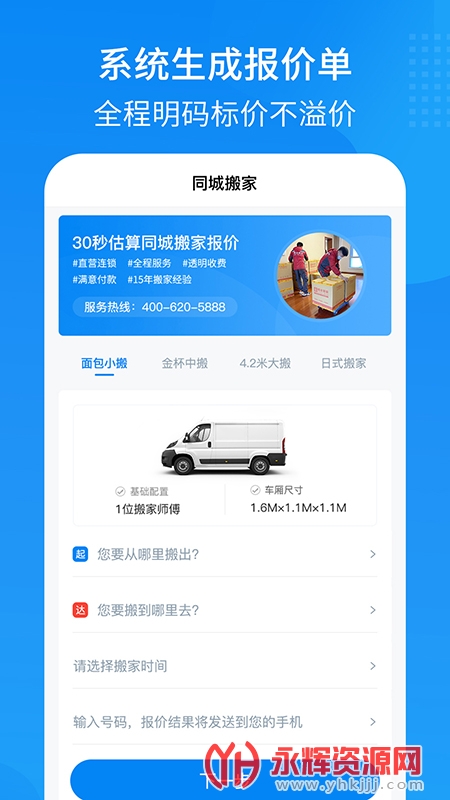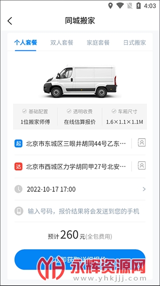 2、按照自己的搬家需求选择进入,填写起点和送达地点的信息,选择预约搬家的时间,最后输入手机号即可获得报价;