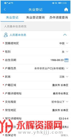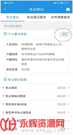 “人员基本信息”部分显示部分人员基本信息,若信息有误,点击右上方“修改”按钮跳转到人员基本信息修改页面进行修改。“失业登记信息”部分需根据提示完善相关信息。