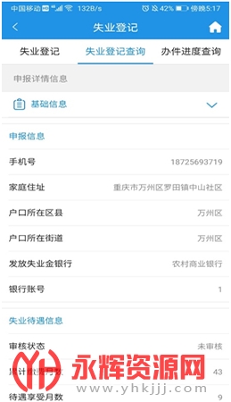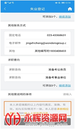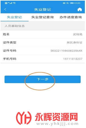 人脸识别成功后首页显示部分人员基本信息,点击“下一步”按钮,跳转至失业登记信息填写页面。