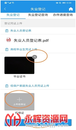 登记凭证上传页面用户需选择相关文件进行上传。选择图片后,点击右上角小图标可删除所选图片重新选择。