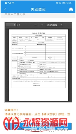 失业人员登记表页面为个人填写的失业登记信息,上方按钮可放大/缩小文件查看信息,确认信息无误后点击“确认签字”按钮,跳转至签字页面。