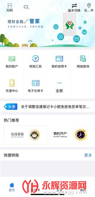 首次使用河北农信手机银行需要输入用户名和密码进行登录,之后再次登录,无需输入,直接进入到“首页”界面
