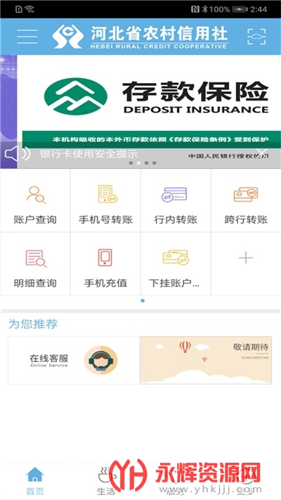 河北省农村信用社移动银行采用先进的安全保障系统。数据是全程加密、密码超额保护、登录超时控制、转账限额是自主设定的。