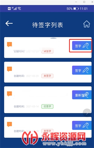 2、进入签字列表,点击“签字”按钮,进行扫脸认证;