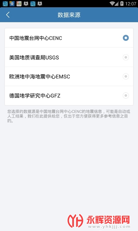 7、除了国家地震台网的地震消息外,还提供美国地质调查局(USGS)、欧洲地中海地震中心(EMSC)和德国地学研究中心(GFZ)的地震消息。