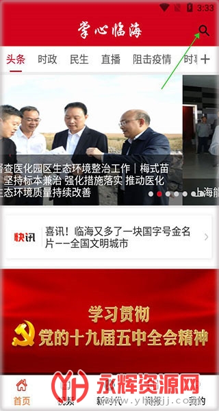 1、下载安装app,打开软件进入首界面,这里用户可以在箭头指向位置搜索自己想要看的新闻