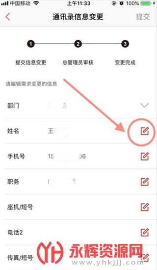 2、通讯录信息变更里,修改需要修改的内容,并填写变更的原因后,点击提交后等待审核结果;