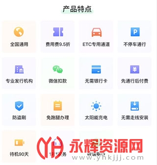 4、以及可以查看到ETC的产品特点,例如全国通用、不停车通行、太阳能充电、先通行后付款等特点。
