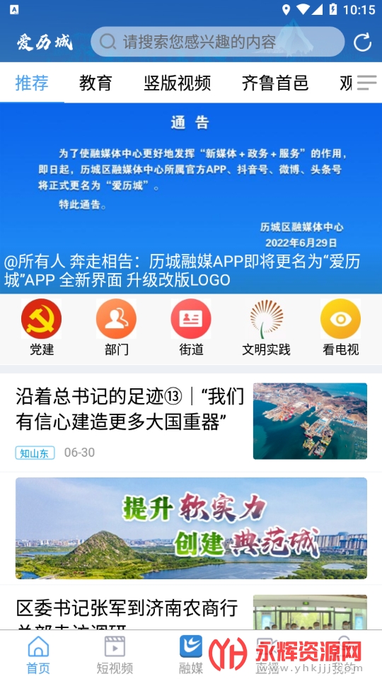 爱历城app官方版是一款非常好用的线上官方综合融媒体服务平台软件。这款软件可以查看历城党建、部门、文明实践、街道等内容,还有精彩短视频和直播节目。通过移动全媒体播出发布系统,实现手机与电视机深度互动,拥有新闻、短视频、融媒、直播、服务等多种功能。是引导及服务历城区的掌上好帮手。如果您对这款软件感兴趣的话,欢迎您来永辉资源网下载体验!
