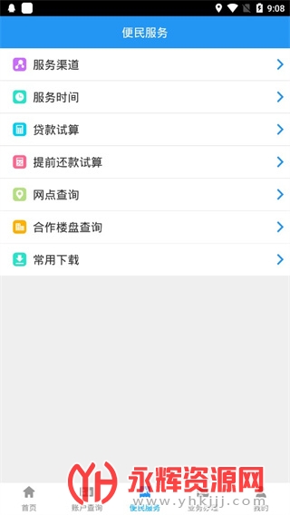 3、在便民服务中大家可以看到有贷款试算、网点查询等等。