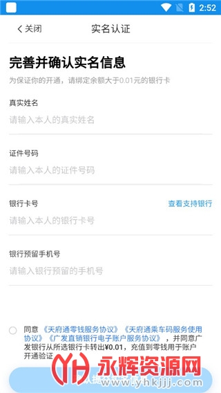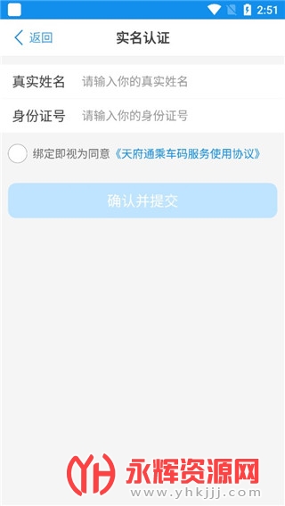 5、选择账户认证,在实名认证栏中输入您的姓名、身份证号、本人银行卡号(非信用卡)、银行预留手机号,即可开通乘车二维码。