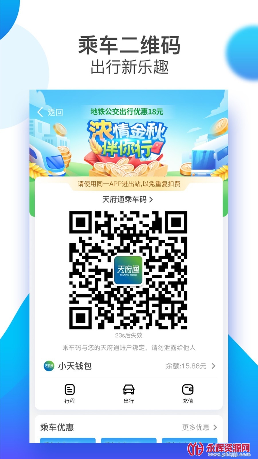 天府通乘车是一款非常好用的移动端成都市政交通一卡通软件。用户可以在这开软件上面开通二维码用于乘坐公交、地铁,并且天府通支持微信、支付宝等线上付款方式,使用起来方便快捷,使用户可以及时掌握最新的线路信息。不但如此用户还可以绑定自己的公交卡,而且随时都能查看公交卡内的余额、查询累计消费与消费记录,即使卡内余额不足也能随时一键充值。如果您需要这款软件的话,不妨来永辉资源网下载体验一番吧!