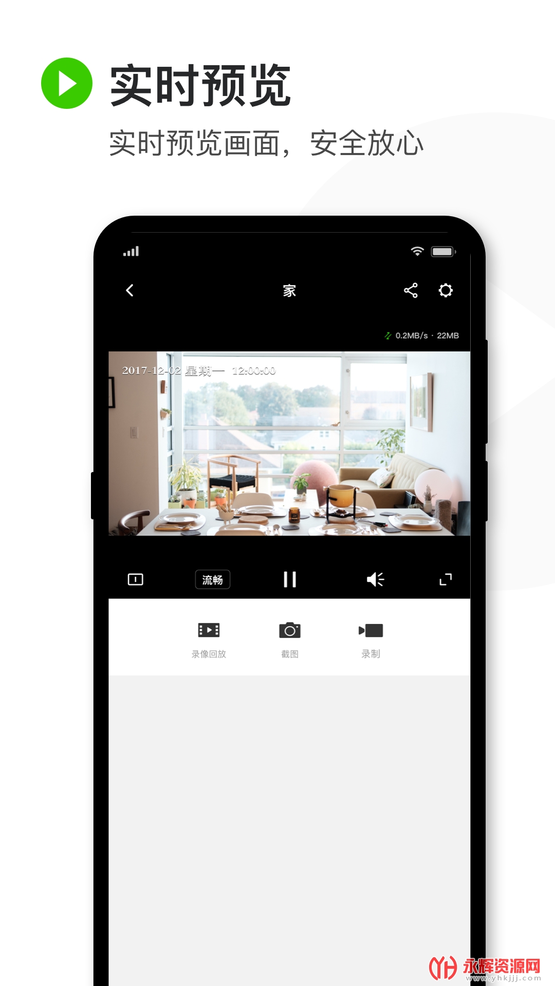 3、通过手机连接摄像机后随时随地观看清晰流畅的实时画面。