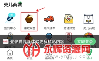 1、进入爱武隆app的窗口界面,点击“赚锑壳儿”。