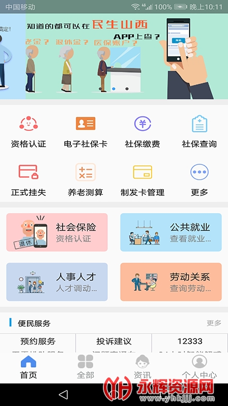 民生山西是一款专为山西市民打造的社保服务类手机客户端软件。通过云计算、大数据等信息化手段,以社保卡持卡库为基础,方便用户在手机上查询养老保险、失业保险、就业服务、生育保险等服务。同时,软件还提供了第三代社保卡生物特征采集和退休人员养老保险生存认证等功能,并推出了“金融 社保”一站式服务,方便用户缴纳社保费用,享受基础生活福利服务,提高生活质量。此外,民生山西还提供其他多种线上服务功能。如果您需要这款软件的话现在就来永辉资源网下载体验吧!