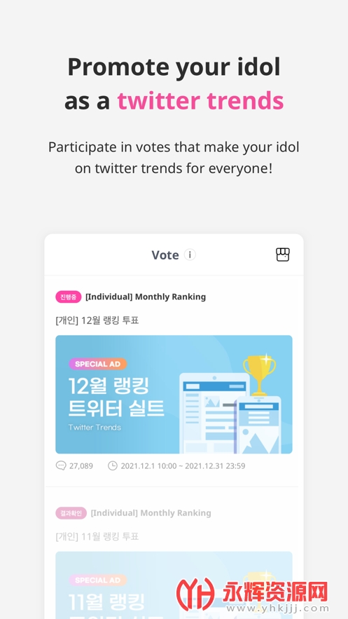 投票活动:IDOLCHAMP提供了各种投票活动,让用户可以为自己喜欢的韩国明星投票并支持他们。这些投票活动涵盖了多个方面,如最佳人气曲目、最热门制作人等,使粉丝们能够积极参与和影响明星的排名和成绩。