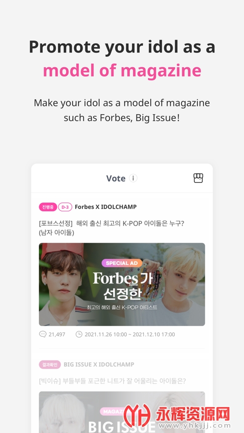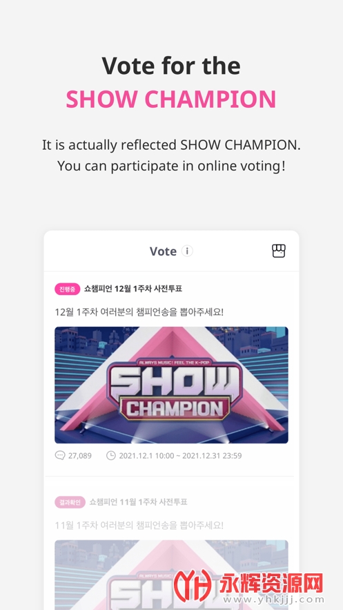 IDOLCHAMP是一款专门为韩国明星投票、查看韩国明星动态的移动端手机软件。用户可以在这款软件上为自己喜欢的韩国明星投票,并查看他们的票数。此外,用户还可以购买相关的周边产品。IDOLCHAMP还提供同步直播和韩文翻译功能。《Show Champion》是MBC Music台于2012年开播的音乐节目,每周选出最佳人气曲目、最热门制作人和最值得关注的新人等三个部门的冠军。观众通过投票选举新人冠军,被选中的歌手将继续出演下周的直播节目。如果您对这款软件感兴趣的话,不妨来永辉资源网下载体验一番吧!