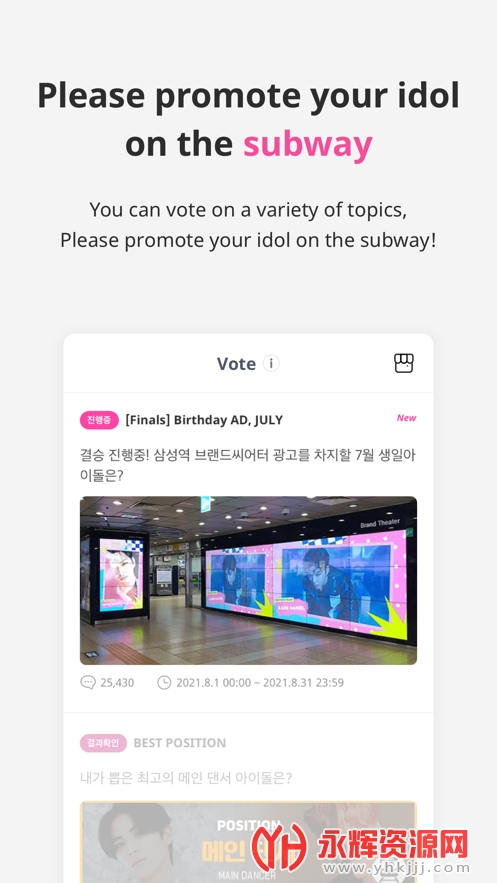 韩国明星投票:用户可以在IDOLCHAMP上为自己喜欢的韩国明星进行投票。这些投票可以是针对最佳人气曲目、最热门制作人或其他相关活动的投票。通过投票,用户可以为自己喜爱的明星提供支持并帮助他们获得更高的排名。
