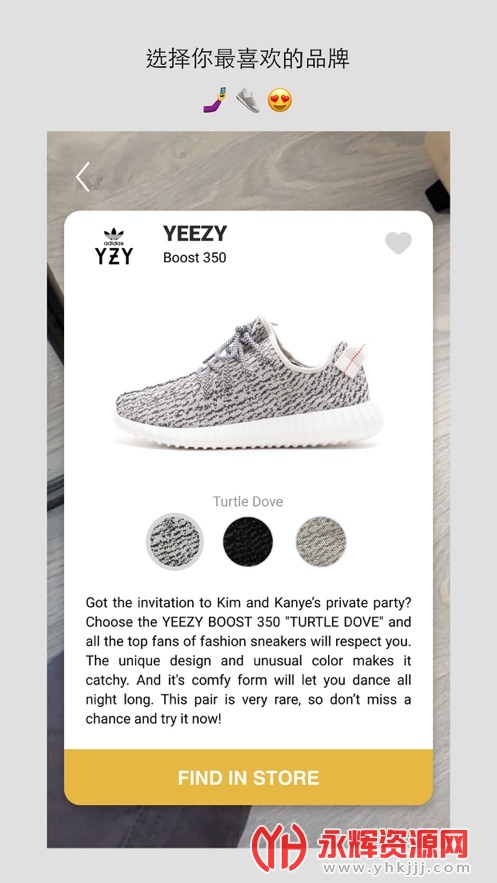 2、Wanna Kicks官方版通过AR增强现实技术与智能手机相机的结合,帮助你看到YEEZYBOOST350等运动鞋「穿」在自己脚上的效果。
