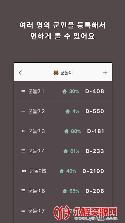 Goondori提供简单易懂的界面风格,并支持多人观看数据。这款软件专为明星粉丝打造,可以帮助用户查看喜欢的偶像的服役日期,了解他们离退伍还有多久,并支持同时添加多个人物进行查询。