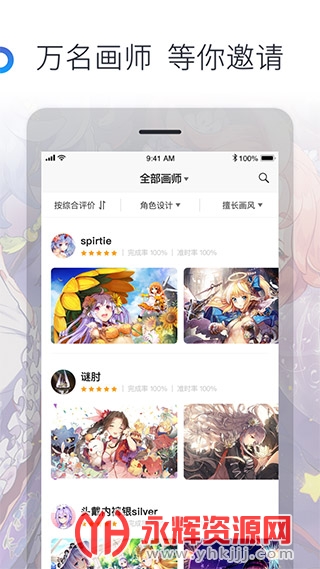 万名画师资源:平台上拥有万名画师的资源,涵盖各式风格的优选作品,满足企划方对不同类型插画的需求。