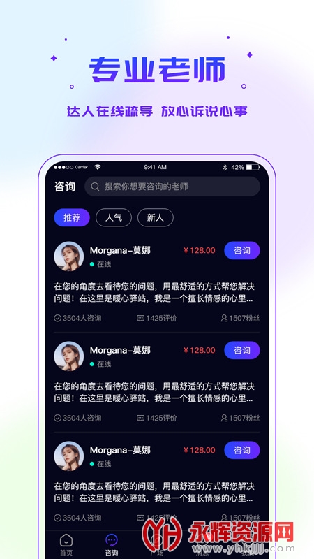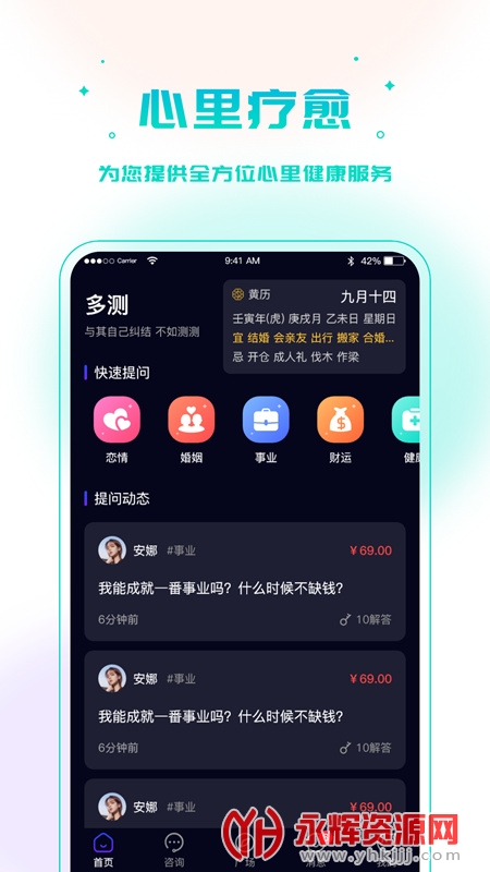 多测心理咨询是一款出色的移动端心理健康服务平台应用软件。该软件为用户提供解决心理问题的专业咨询服务。界面简洁易用,用户可以通过搜索和分类等方式方便地找到合适的心理咨询工具。如果您对这款软件感兴趣的话,不妨来永辉资源网下载体验一番吧!