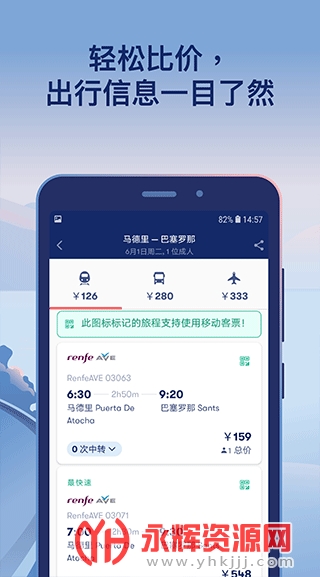 通过Omio,您可以快速查找和比较不同运输方式的票价和时间,以便做出明智的选择。您可以轻松预订火车、飞机和巴士票,并在没有繁琐手续的情况下完成支付。此外,Omio还提供了详细的行程信息,包括车次、航班号和预计抵达时间,以帮助您更好地计划行程。