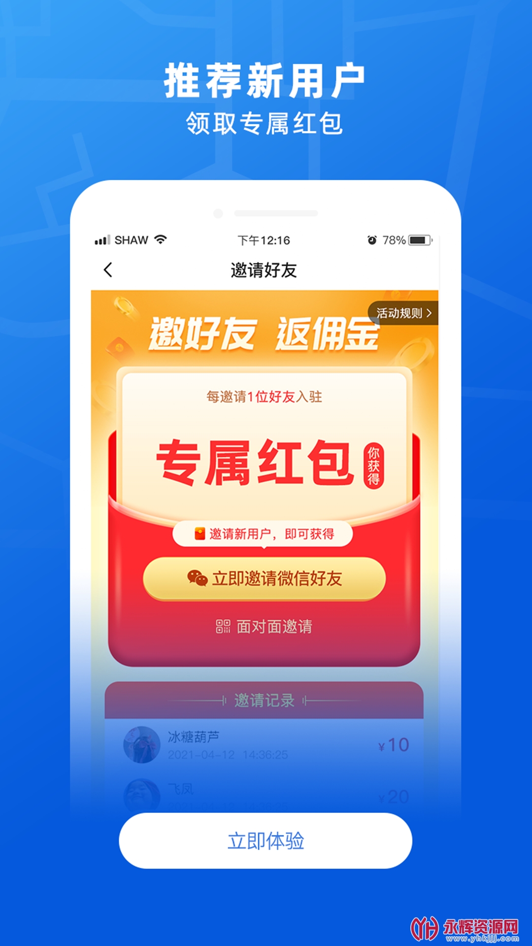 369玖玖帮是一款移动端城市智能生活服务应用软件。该软件基于人、车、物的交互式场景,利用社会剩余资源为用户提供“顺路网约车、同城/跨城顺路送达、跑腿帮买、万能生活服务、品牌商城、积分兑换、大众红包抢不停”等多种创业及服务板块。