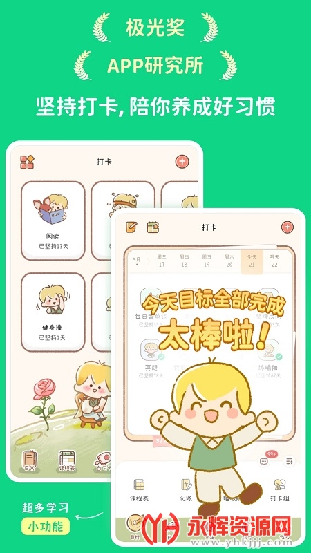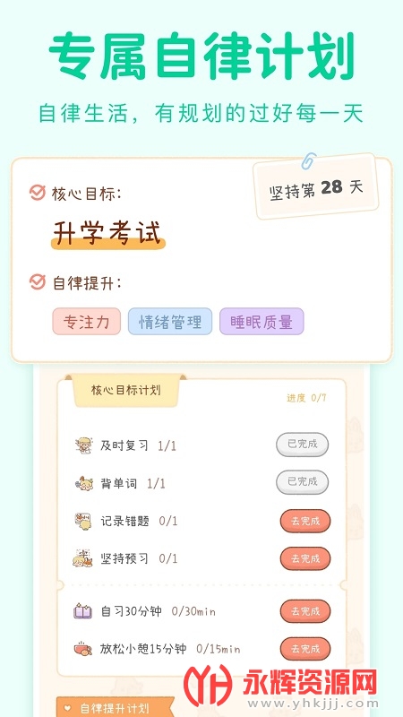 1、目标设定与打卡记录:通过设定目标和记录打卡,用户可以清晰了解自己的进展和成就感。