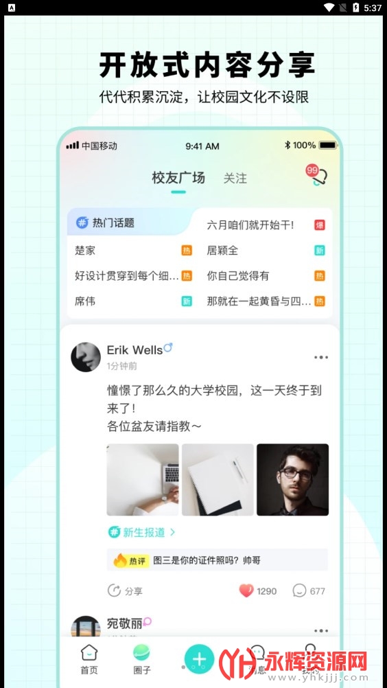 校友广场:浏览最近热门话题排行榜,了解其他校友的留言动态,随时掌握最新的校园资讯。