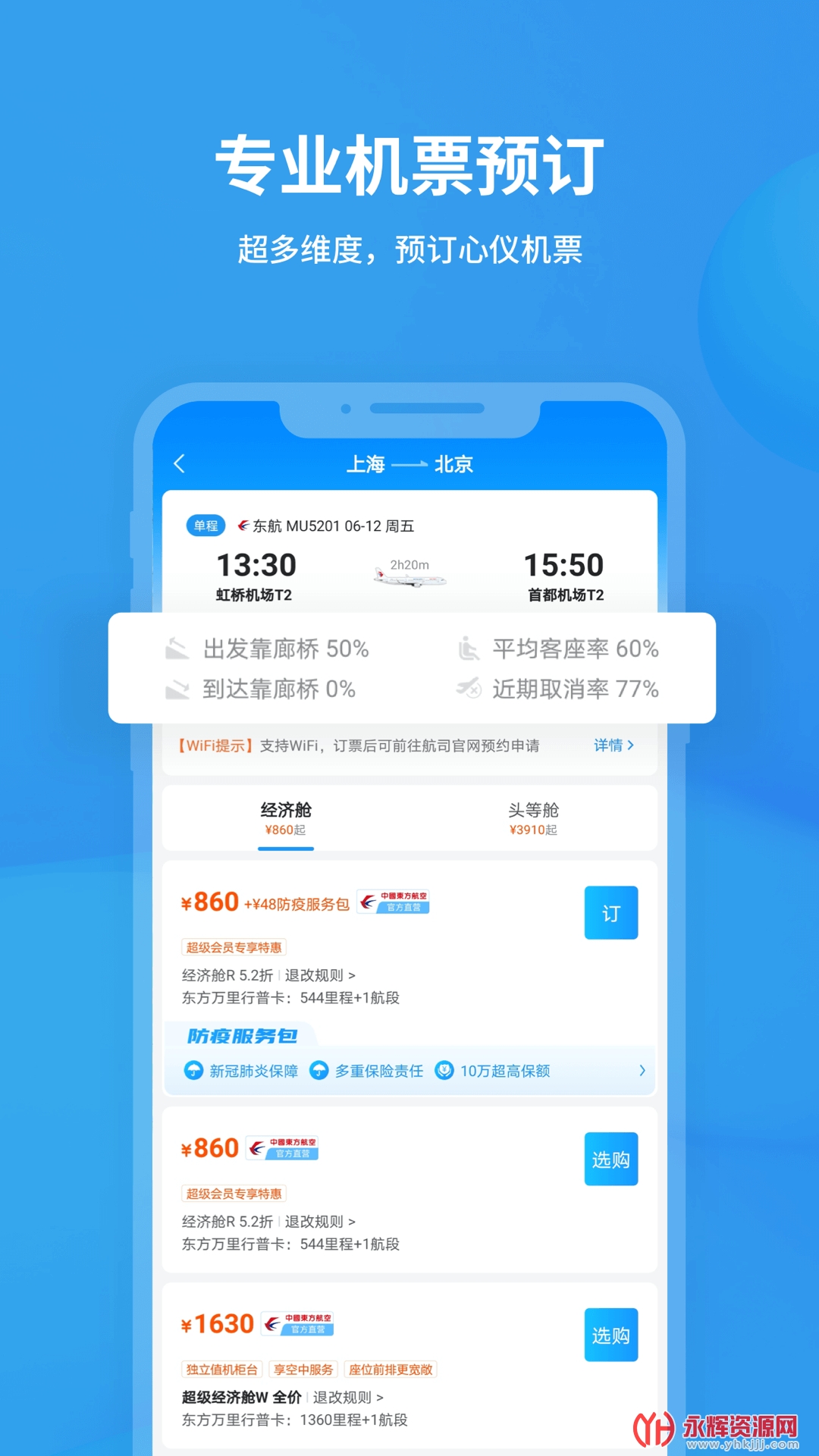 航班预定:支持用户一键在线选票、订票,便捷快速完成航班预定。