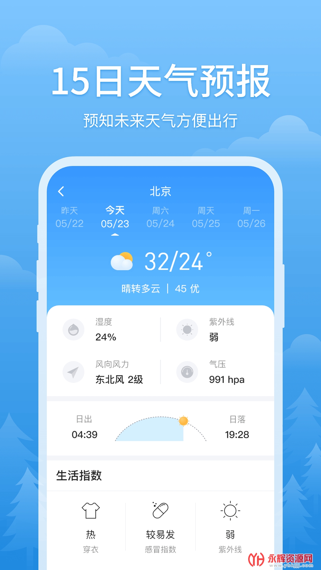 简单天气预报是一款非常专业且易用的移动端掌上在线天气预报应用软件。这款应用软件能够为用户提供实时的天气预报、24小时的天气趋势、未来15天的天气预测,以及空气质量和生活指数等。无论是日常生活还是出行计划,简单天气预报都能帮助用户了解天气情况,做出明智的决策。如果您对这款软件感兴趣的话,不妨来永辉资源网下载体验一番吧!