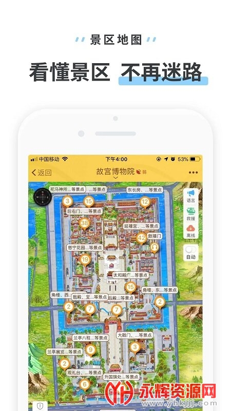 游览信息:景区出入口、餐厅、商店、ATM、卫生间、Wi-Fi设施等一目了然,方便用户出行。
