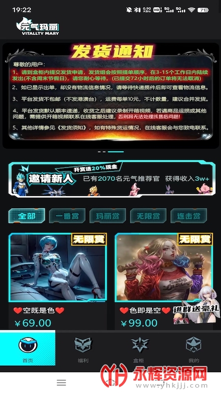 元气玛丽是一款功能齐全且简单易用的移动端在线正版盲盒购物平台应用软件。这款应用软件能够为用户提供各种类型盲盒商品的选择,天天免费抢上万元手办数码奖品,超值抽选高达,挑战人气欧皇,方便选购时下热门的各大IP加持!可随时随地拆扭蛋机,开福袋,沉浸式开盒体验,天天新品上线!如果您对这款软件感兴趣的话,不妨来永辉资源网下载体验一番吧!