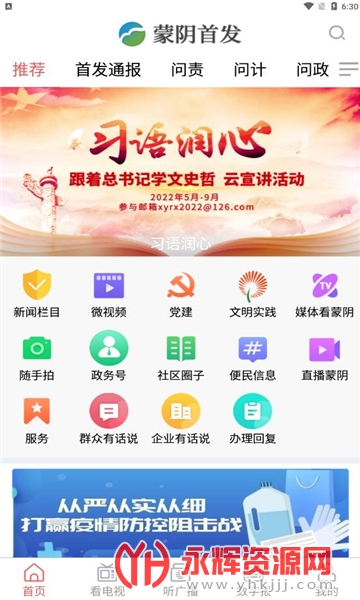 1、资讯动态:蒙阴首发App通过多种视角(直播、视频、图文等),向用户推送最新的蒙阴地区资讯动态,包括新闻、活动、政策等内容。
