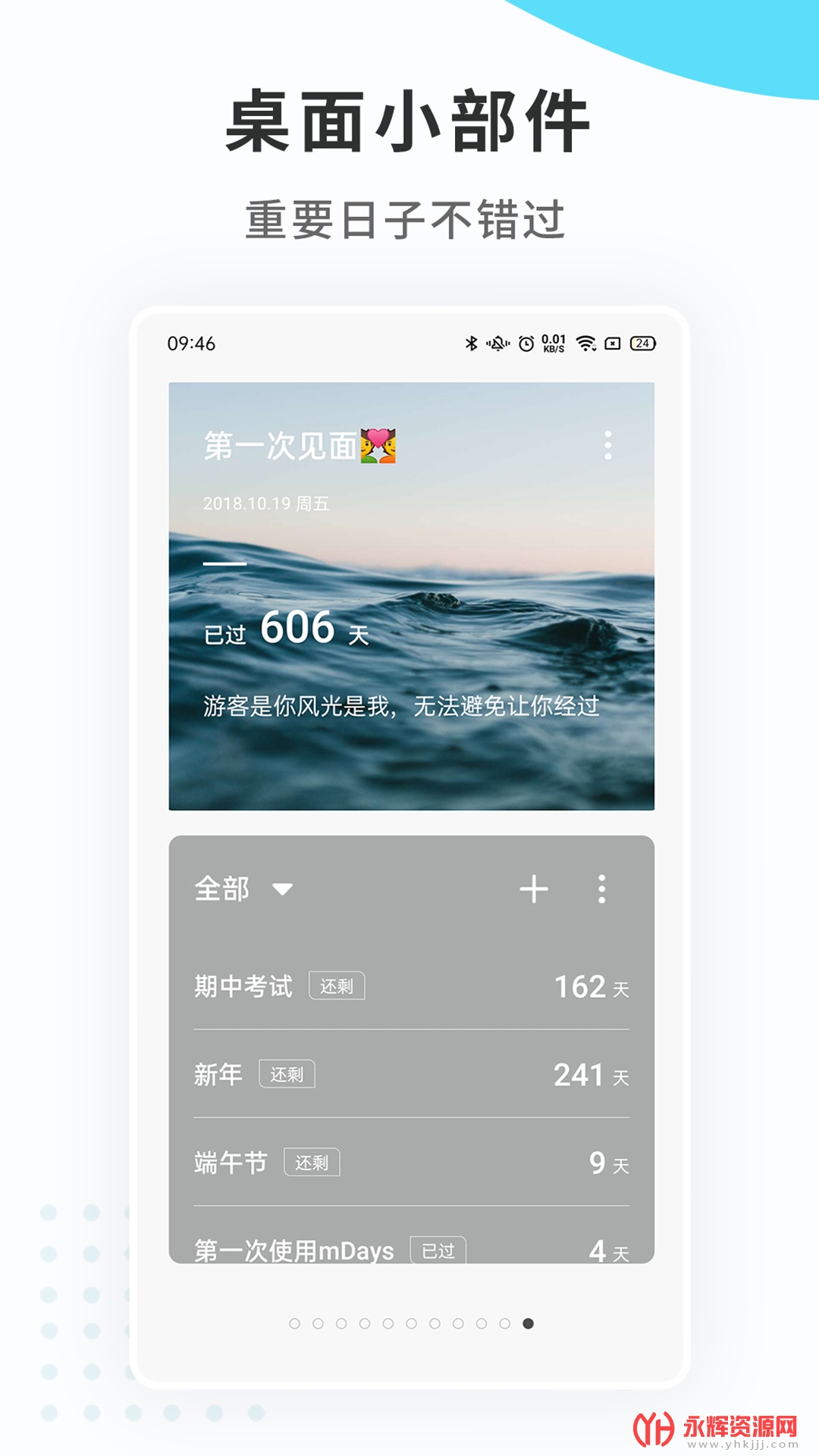 纪念日mDayss是一款功能丰富且非常好用的移动端掌上日记类应用软件。这款软件不仅可以记录日常发生的事情,还可以进行记账和日历管理等功能。该软件拥有简洁清新的界面和简单易用的操作方式,满足用户个性化需求。如果您对这款软件感兴趣的话,不妨来永辉资源网下载体验一番吧!