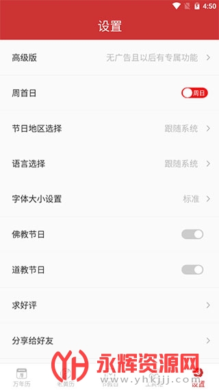 软件特色在于其简洁易用的界面设计和个性化的功能设置。桔子万年历支持用户自由设置周起始日,满足不同用户的习惯需求,而且提供了多种个性化设置选项,如字体大小等,让用户可以根据自己的喜好进行调整。