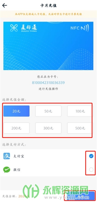 4、将需要充值的公交卡贴在手机背面的NFC感应区内,待手机识别选择充值金额,并选择支付方式后进行支付。