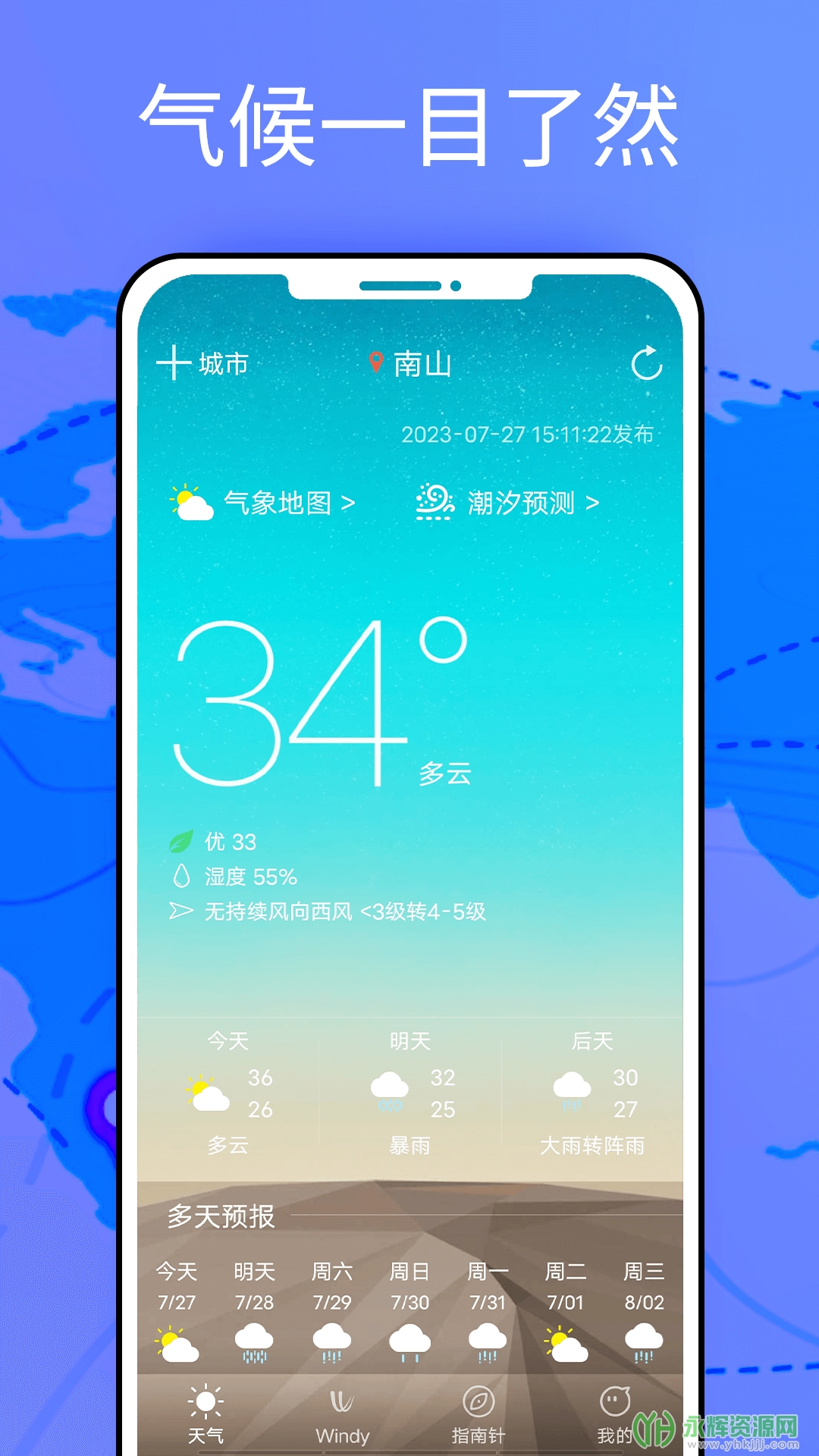 Windy是一款功能强大的天气预报工具,提供全球范围内细致的气象数据可视化服务。这款软件兼具专业性与易用性,集成了如ECMWF、GPS等多个权威的气象数据来源,并通过气象雷达和卫星云图功能,为用户提供实时且全面的天气信息。如果您对这款软件感兴趣的话,不妨来永辉资源网下载体验一番吧!