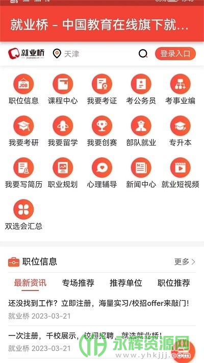 就业桥是一款集就业求职、就业技能培训、就业资讯等多种功能于一体的移动端掌上综合服务平台。软件目前包含“我要找工作”、“我要专升本”、“我要考证”、“我要考研”、“我要考公务员”、“我要创赛”、“我要考事业编”、“我要写简历”、“我要生涯规划”等多个服务模块,涵盖了各种就业需求,为用户提供一站式的求职服务体验。