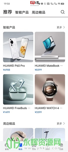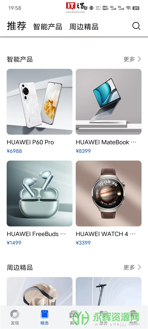 2、精选版块则为“购物频道”,可以购买华为旗下的各种产品,“周边精品”有四款智选产品;