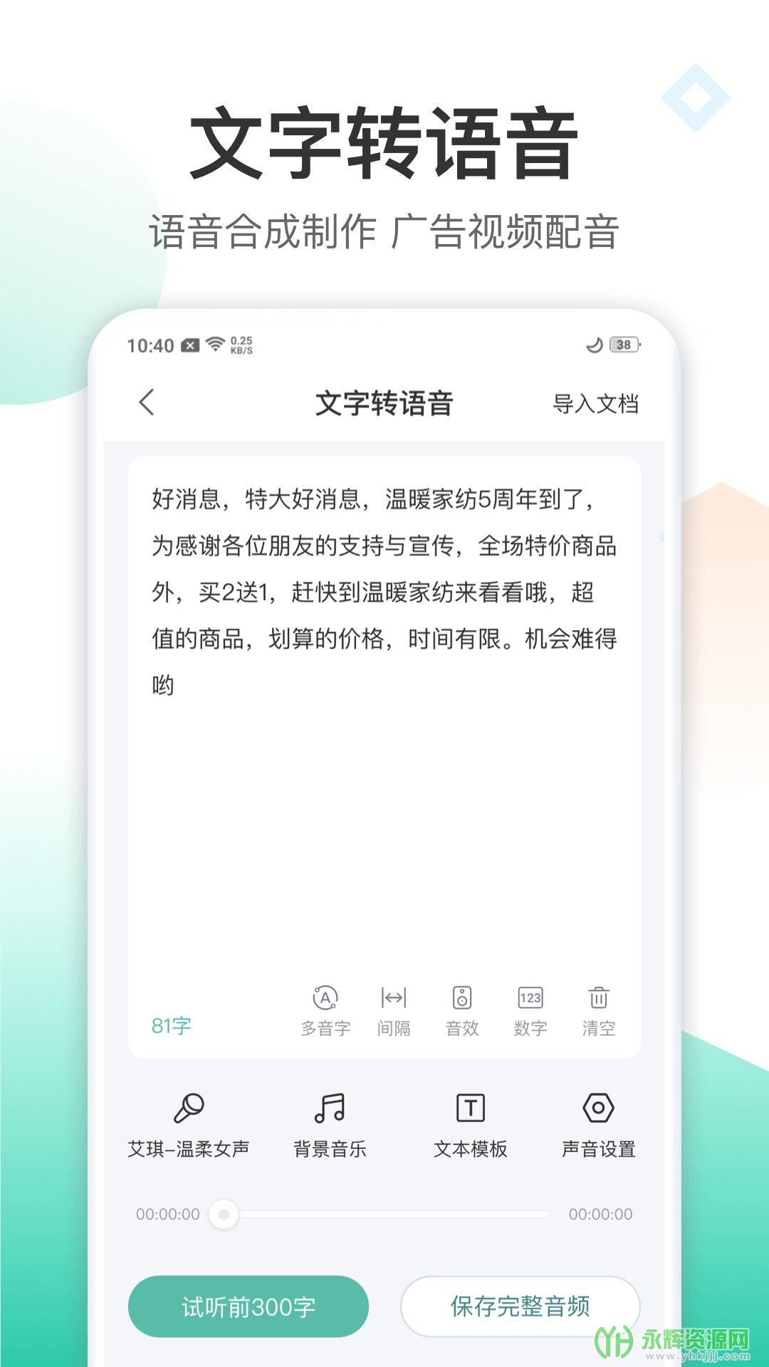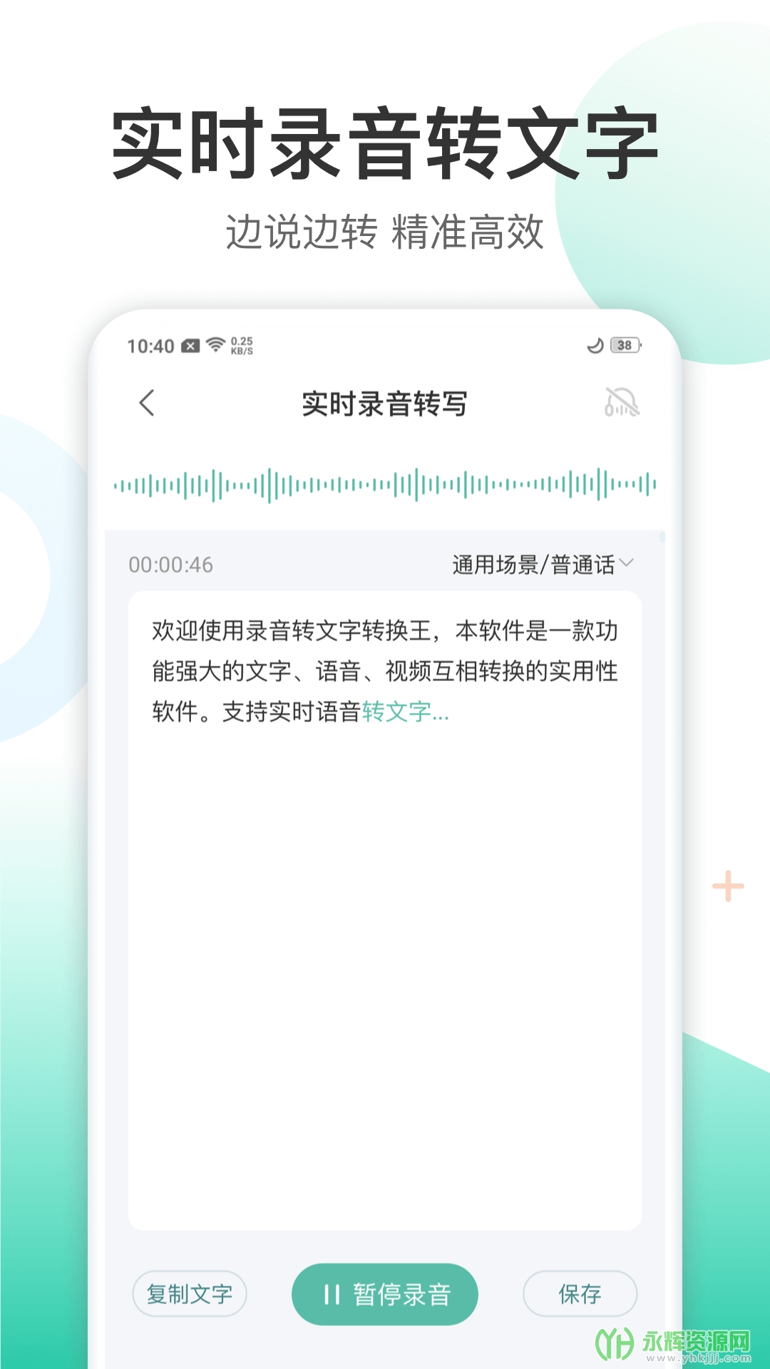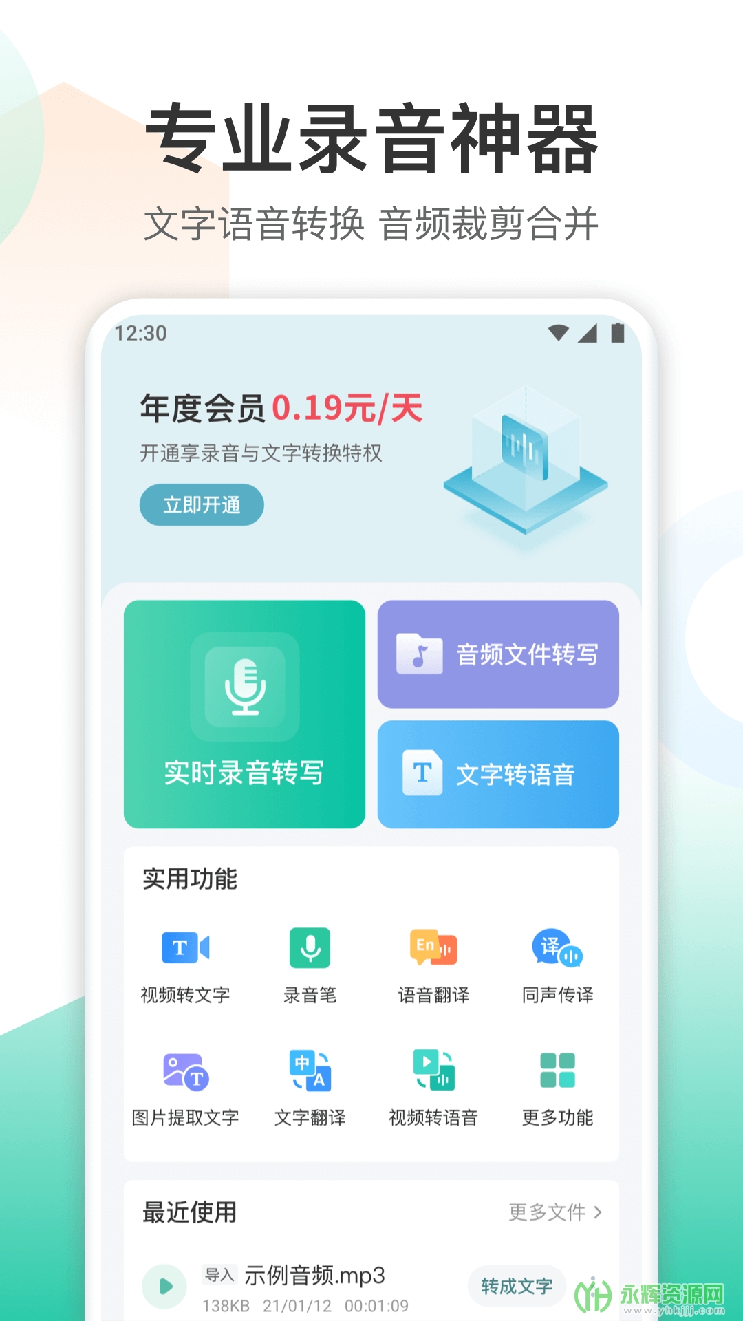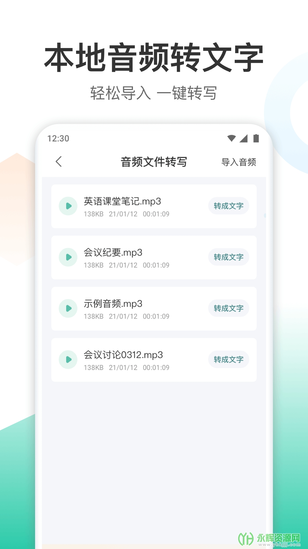 录音转文字转换王是一款集录音转写和文本语音转换为一体的多功能工具软件。它允许用户轻松将音频文件转换成书面文字,同时支持将书面文字转换为不同风格的语音。这款软件适合教育、商务、法律等各种需要音频与文字相互转换的场景,是提高效率和准确记录信息的得力助手。如果您对这款软件感兴趣的话,不妨来永辉资源网下载体验一番吧!